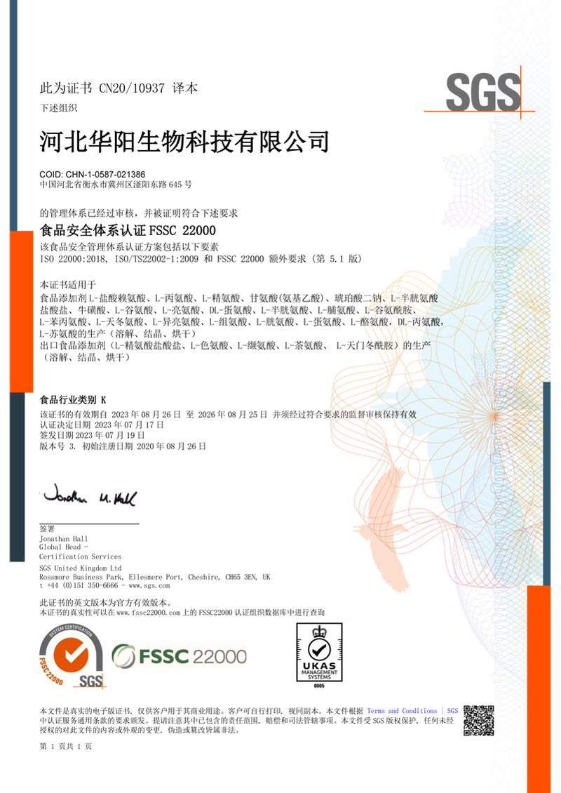 河北華陽(yáng)集團(tuán)坐落于河北省衡水市冀州區(qū)省級(jí)工業(yè)園區(qū)(始建于1987年,前身為冀州市華陽(yáng)化工有限責(zé)任公司)。集團(tuán)下屬四個(gè)公司:河北華陽(yáng)生物科技有限公司、河北華悅氨基酸科技有限公司、滄州華晨生物科技有限公司、衡水市陽(yáng)力商貿(mào)有限公司。主要生產(chǎn)甘氨酸、L-丙氨酸、L-蘇氨酸、DL-蛋氨酸、L-賴(lài)氨酸鹽酸鹽、L-半胱氨酸鹽酸鹽、干貝素等氨基酸系列食品級(jí)產(chǎn)品,廣泛應(yīng)用于食品、飲料、飼料等行業(yè)。......